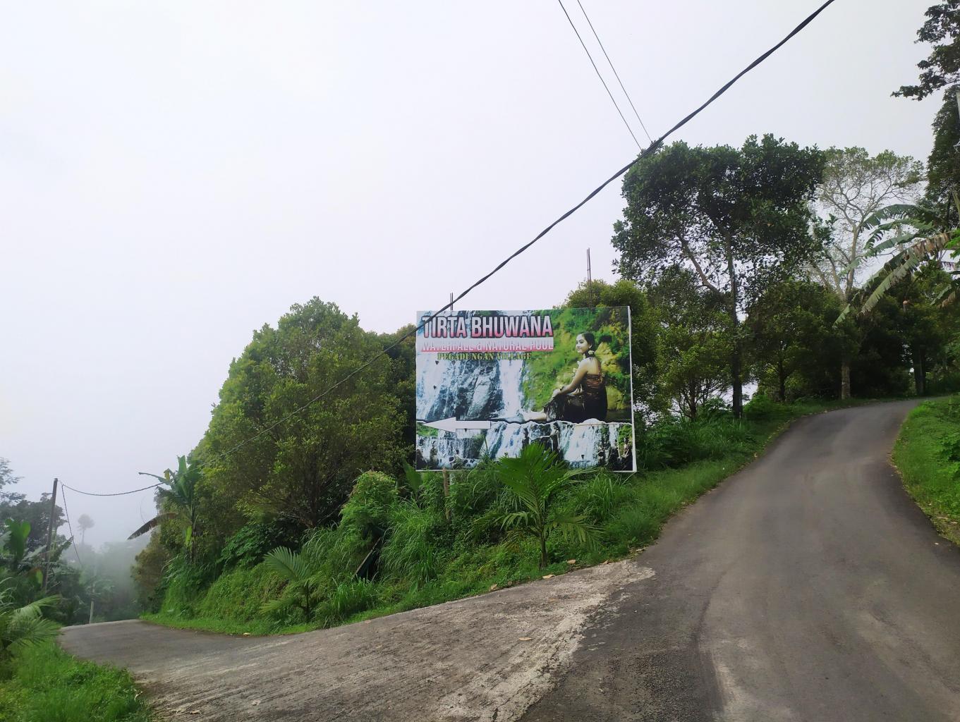 Dari desa Pegadungan anda akan menemukan papan nama dan baliho yang menjadi petunjuk ke air terjun Tirta Bhuana. Jalan menuju ke kawasan ini berliku, kadang menanjak dan menurun, jadi berhati-hatilah saat berkendaraan. Bisa pakai panduan google maps atau bisa bertanya dengan warga setempat jika kehilangan arah.
