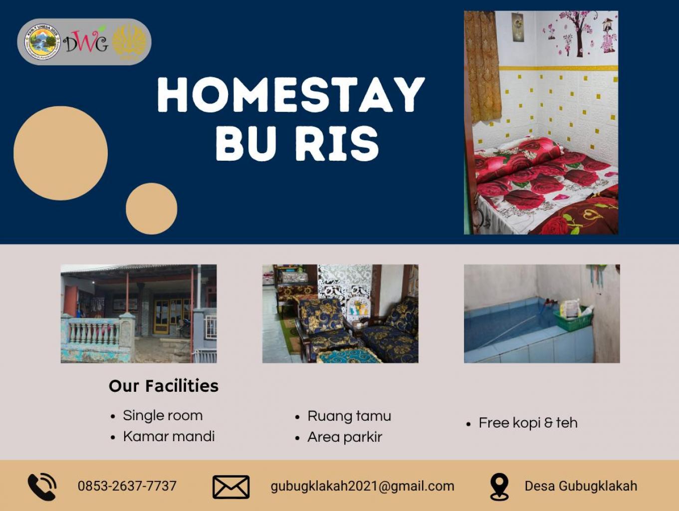 Kamar di Homestay Ibu Ris didesain sederhana namun tetap memberikan kenyamanan maksimal bagi para tamu. Ruangan dilengkapi dengan tempat tidur bersih dan rapi, selimut hangat, serta pencahayaan alami dari jendela yang menghadap ke area pedesaan yang sejuk. Tersedia juga lemari kecil untuk menyimpan barang pribadi dan colokan listrik di dekat tempat tidur untuk menunjang kebutuhan wisatawan. Suasana kamar yang bersih dan tenang menjadikan homestay ini pilihan tepat bagi wisatawan yang ingin beristirahat sebelum melanjutkan perjalanan menuju Gunung Bromo, Ranu Kumbolo, atau Semeru