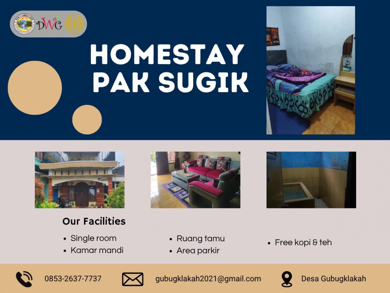 Kamar di Homestay Pak Sugik didesain sederhana namun tetap memberikan kenyamanan maksimal bagi para tamu. Ruangan dilengkapi dengan tempat tidur bersih dan rapi, selimut hangat, serta pencahayaan alami dari jendela yang menghadap ke area pedesaan yang sejuk. Tersedia juga lemari kecil untuk menyimpan barang pribadi dan colokan listrik di dekat tempat tidur untuk menunjang kebutuhan wisatawan. Suasana kamar yang bersih dan tenang menjadikan homestay ini pilihan tepat bagi wisatawan yang ingin beristirahat sebelum melanjutkan perjalanan menuju Gunung Bromo, Ranu Kumbolo, atau Semeru.