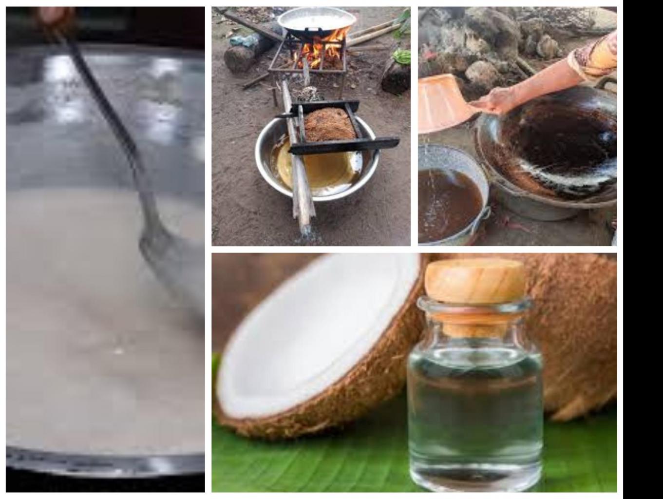 Parutlah daging kelapa dengan parutan.Hasil parutan lalu dicampur dengan air matang. Sesudahnya peras dan saring hingga menghasilkan santan.Tuangkan air santan tersebut ke penggorengan. Goreng dengan nyala api yang kecil.